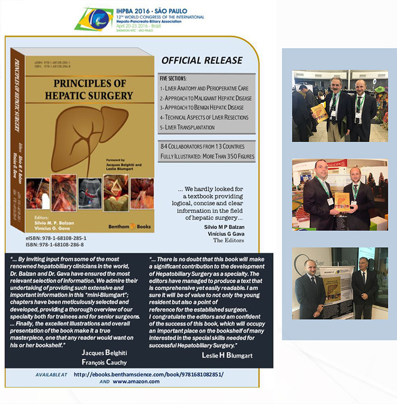 Além de editor participei como autor em vários dos 32 capítulos. Vendido pela editora Bentham Science foi adotado como livro referência em serviços de cirurgia de diferentes países. Reproduzo no final deste tópico o prefácio do livro, escrito por dois dos maiores nomes da cirurgia de fígado, professores Jacques Belghiti (França) e Leslie Blumgart (EUA). O professor Blumgart foi o criador da “bíblia” da cirurgia de fígado, pâncreas e vias biliares. Ambos tecem comentários sobre as características do livro e honrosos elogios. Neste prefácio nosso livro foi chamado carinhosamente de “mini-Blumgart”, um orgulho!